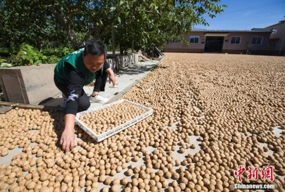程子昂在检查核桃晾晒情况。图片来源:中新网