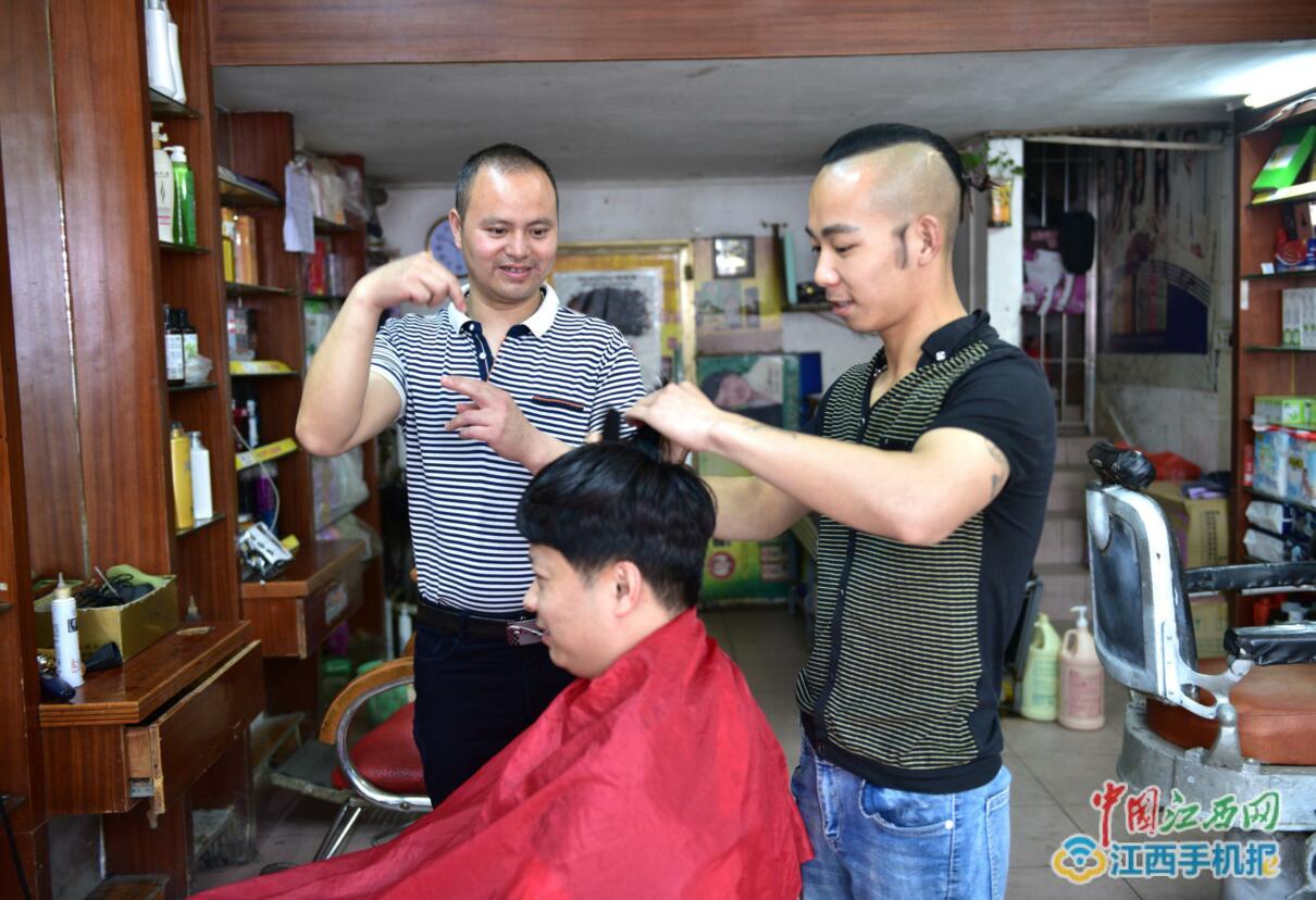 李祝平在指导聋哑徒弟为客人剪发(图片来源:中国江西网)