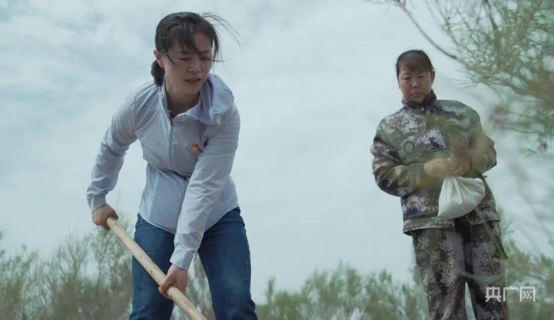 姜莉玲(左)在压沙植树现场。图片来源:央广网