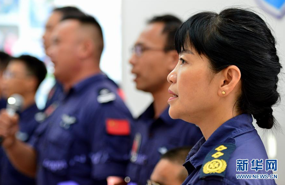 陈素珍(右一)与厦门蓝天救援队的队员们合唱队歌。图片来源:新华社