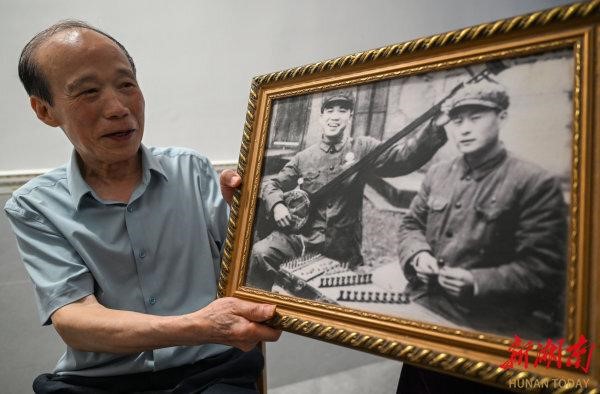 李舒尤老人(照片中抱三弦者)回忆当年在部队的往事。图片来源:湖南日报