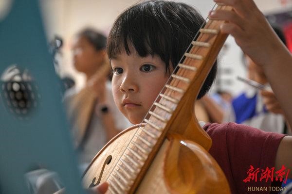 6岁的张尹露经过1年的小阮学习,已经会弹奏多首曲目。图片来源:湖南日报