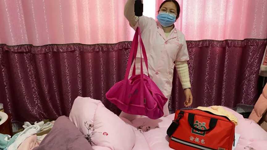 罗海香用简易的布袋做成手提秤,为新生儿“称体重”。图片来源:中国妇女报