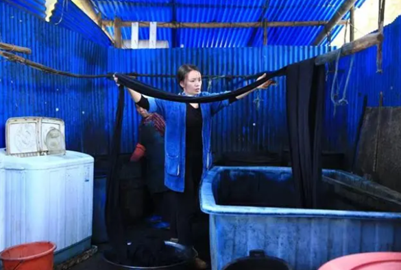 杨成兰在“猪圈工作室”里染布。图片来源:新华社