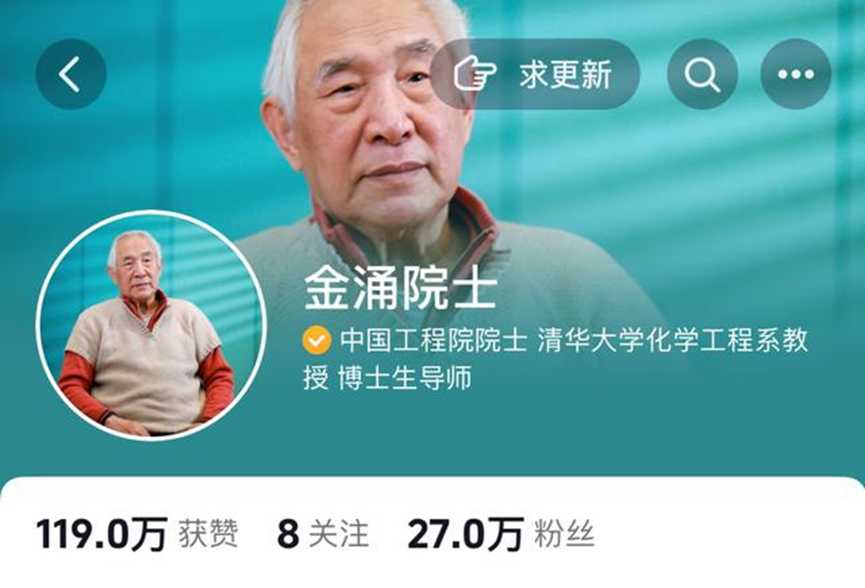 目前,金涌在某短视频平台的账号已收获27万粉丝,网友累计点赞119万次,播放量最高的一条和“可控核聚变”有关,获44万网友点赞。他的科普短视频累计播放量超1.6亿次,其中仅“金涌谈创新教育”系列的播放量就已超过2200万。