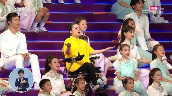 “亚残运火炬缓缓熄灭,此刻,不想说再见,我们一定会再相逢。”轮椅上的杜诚诚位于火炬下方,面对着一群视障儿童,她将现场的舞蹈、特效、火炬熄灭等视觉场景转化为生动的语言,清亮的声音在杭州奥体中心体育场内久久回荡。