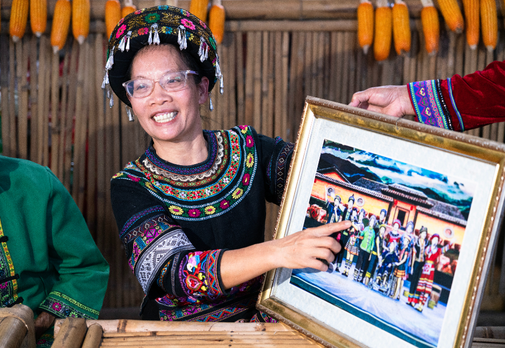 蓝连青在介绍和家人一起参加活动的照片。图片来源:新华网