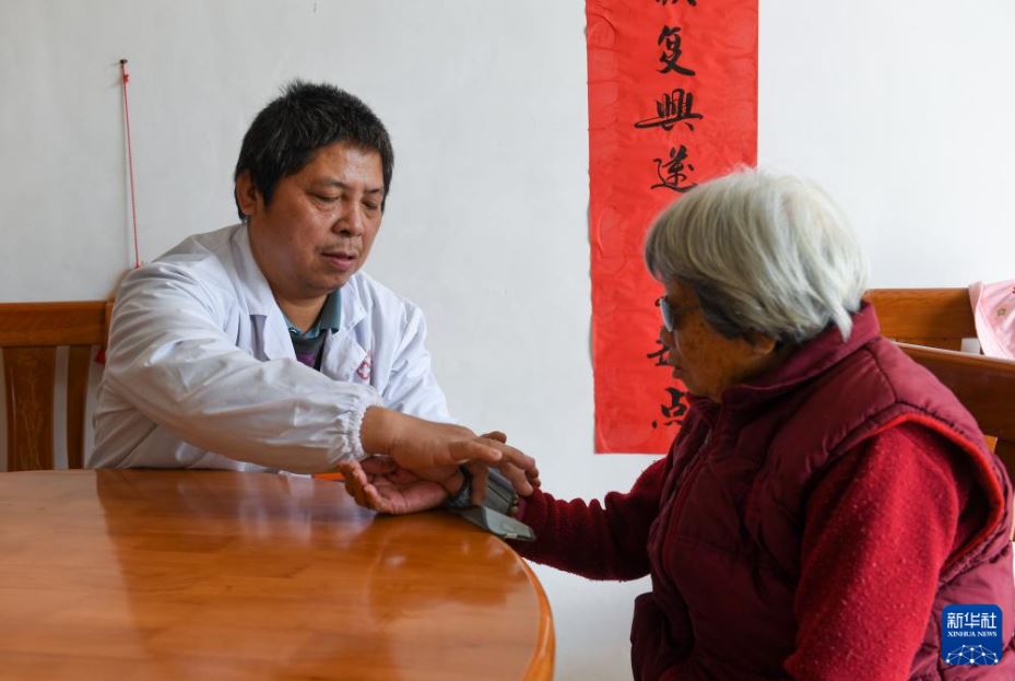 郑仁才为村民测量血压(图片来源:新华社)