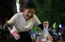晚上10点,浙江省杭州市刀茅巷60号院的大门“咯吱”一声打开,门内传来窸窸窣窣的响声。收拾出三个大编织袋,拿上小钩子,91岁的王坤森推着三轮车出了门。
